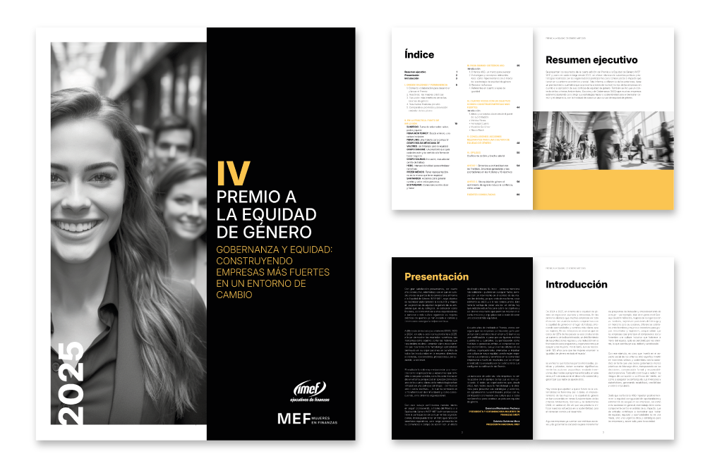 en sus organizaciones, a sus equipos de trabajo y a la sociedad. El premio a la equidad de género IMEF-MEF busca difundir la importancia de la innovación y buenas prácticas para promover la inclusión y desarrollo profesional del talento femenino para que las empresas puedan alcanzar sus objetivos estratégicos de sostenibilidad.